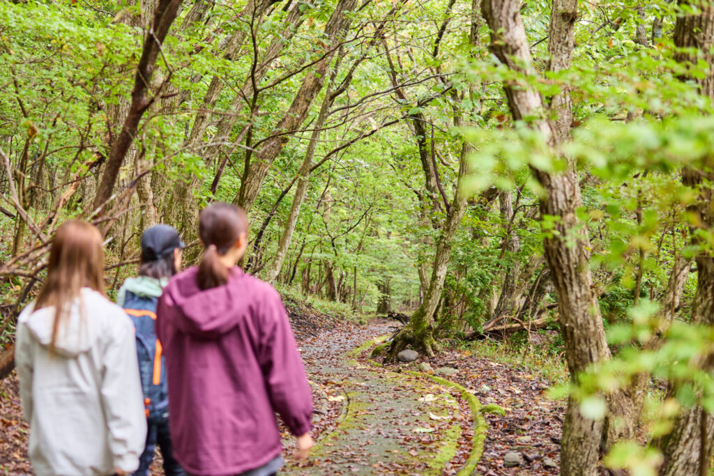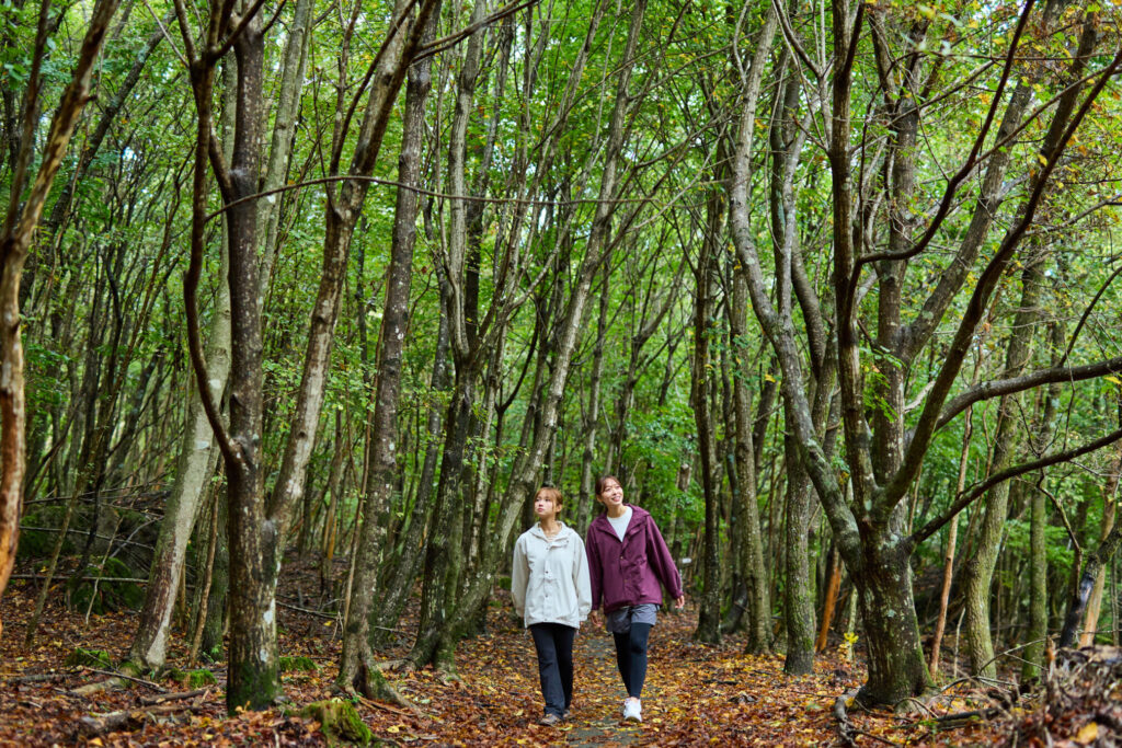 歩道は整備され、緩やかな下りで歩きやすい。森の中の小道は心地よく、季節ごとに多様な植物が姿を見せるそうだ。夏に白い花を咲かせるノリウツギはアジサイの仲間。春の芽吹きを告げるマンサクも、黄色の花を咲かせる準備をしていた。ミズナラの木はシイタケの原木であり、かつては炭焼きにも重宝された。足元にはたくさんのドングリが落ちていたが、根を張り、育つのはごくわずかという。