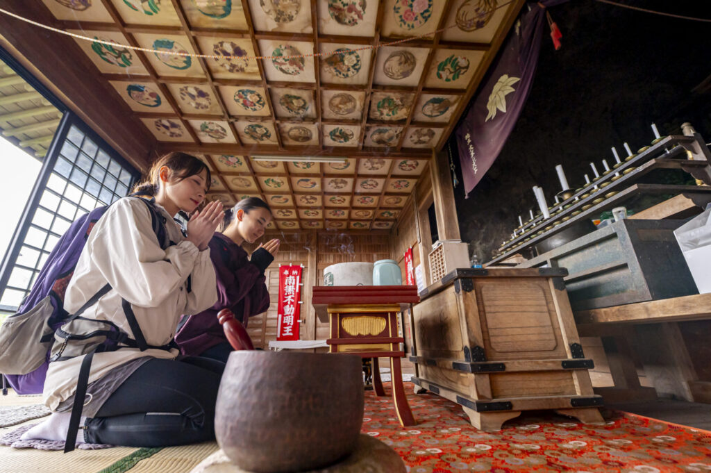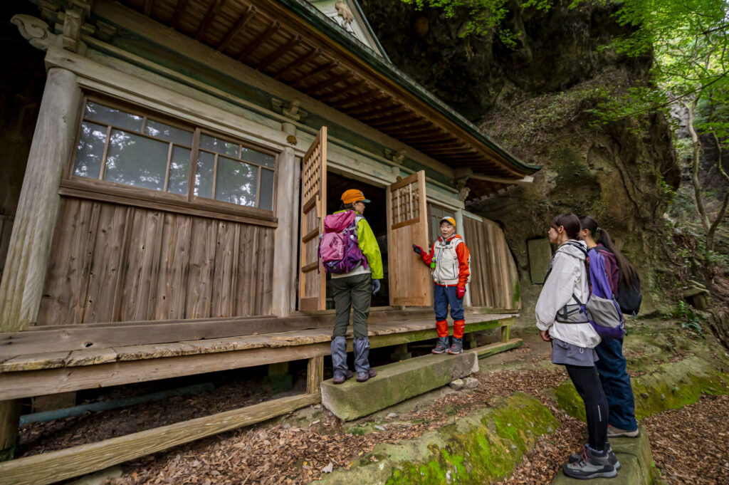 急な岩場を登ると、岩壁に寄り添うように建てられた「五辻不動尊」がある。「よくこんな場所に建てたものだ」と思わずにはいられない。不動明王は、昔から人々の暮らしを見守ってきた。建物は無人で、自由にお参りができる。他のルート上にも無人の本堂があるそうで、風雨や動物が入り込まないよう、参拝後の戸締まりは忘れずに。