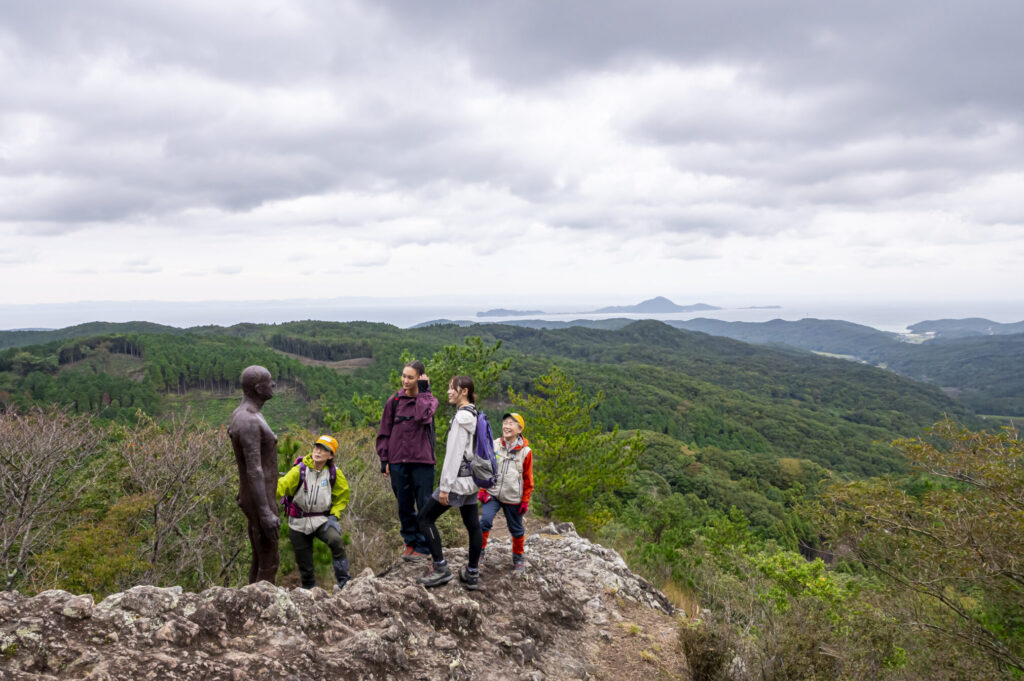 近くの五辻(いつつじ)不動駐車場から10分ほど登ったところに、英国の彫刻家アントニー・ゴームリー氏の作品がたたずむ。2013年に設置された像は、風雨の中で風合いは変化し、周囲の岩場はもちろん、海や森とも調和しているよう。自然と現代アートの対話を思わせる。岩場からは周防灘(すおうなだ)と姫島を臨む絶景も楽しめた。