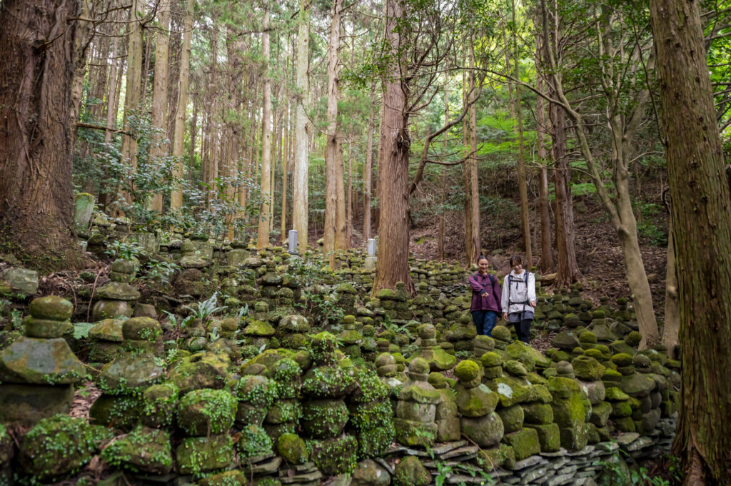 奥の院の横にある枕の岩屋は仁聞菩薩の入寂(亡くなった)場所と伝わり、周辺には千基ほどの五輪塔や国東塔がたたずむ。「形一つ一つに意味があります。地・水・火・風・空の世界観です」。井上さんの説明を聞きながら、多くの人が祈りを捧げた当時に思いをはせる。