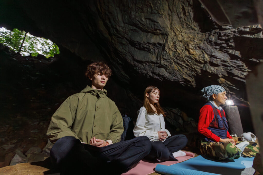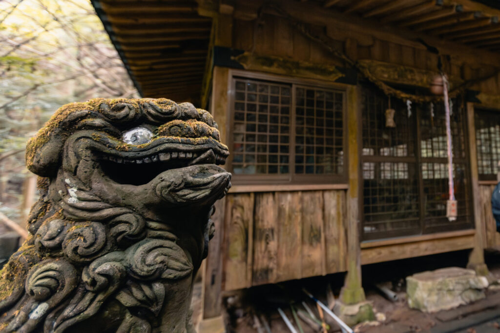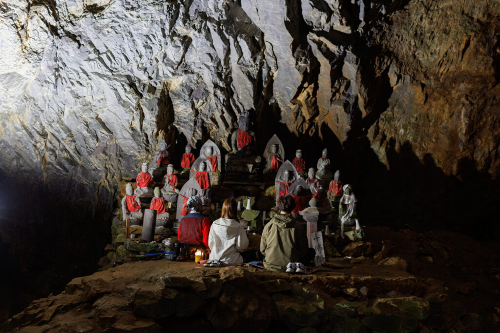 社殿奥にある深く、大きな洞窟も見どころ。整備された石段を慎重に下り、ハンドライトを岩肌に向けると、幻想的な空間が広がり、まるで異世界に来たよう。洞窟内にいたるところにまつられた石仏などの石造物は、社殿と共に市有形文化財に指定されている。最深部には石仏群があり、中央には本持仏の十一面観音菩薩が鎮座する。頭部に11の顔を持ち、人々をあらゆる方向から見守ってくれるといわれる。前に座って目を閉じると、自然と少しずつ心が静まっていくのを実感できた。