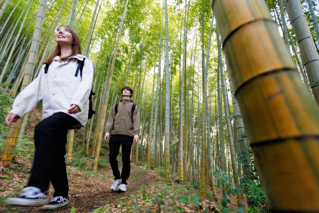旅の締めくくりは、溜水熊野神社近くの「金明孟宗竹(きんめいもうそうちく)」の竹林。孟宗竹が突然変異したとみられ、緑色と黄色の節が交互に入る希少な竹が群生している。竹林をゆっくり歩いて、その美しさを味わう。風が通り抜け、竹林がさわさわと鳴っていた。一本一本が日光を受けてきらめき、まるで、自然が織りなす祈りの空間のよう。