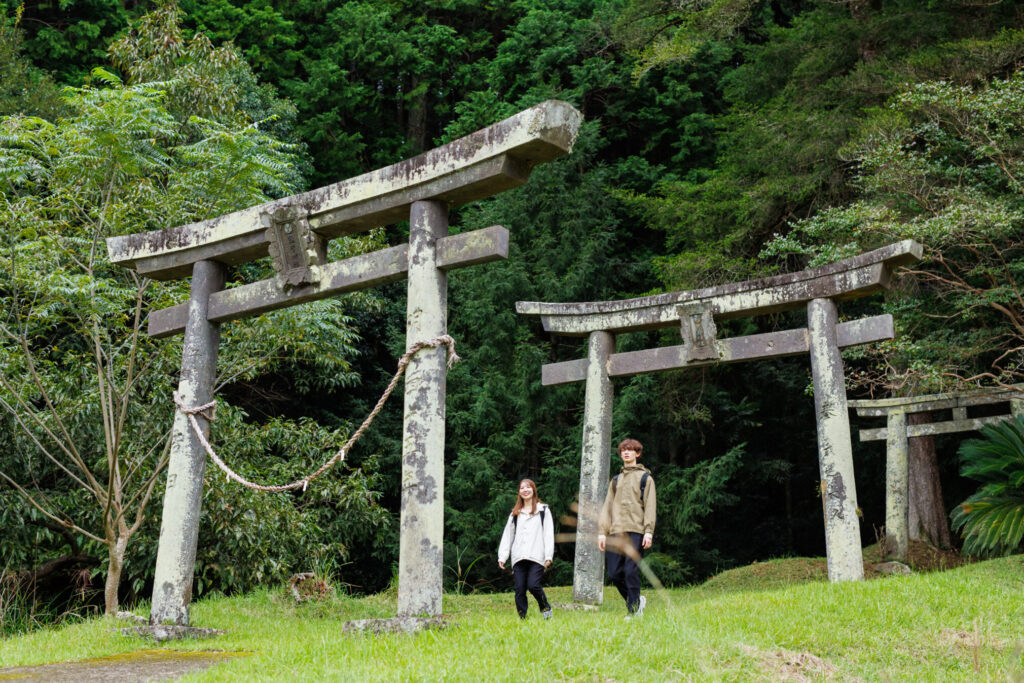 続いて向かったのは、野津町王子の溜水(たまりみず)熊野神社。溜水公民館駐車場に車を止め、歩いて5分ほど。田園に向かって道なりに歩くと、左手に三連の鳥居が現れる。鳥居をくぐり、社殿に近づくにつれ、木々が深く生い茂る。
