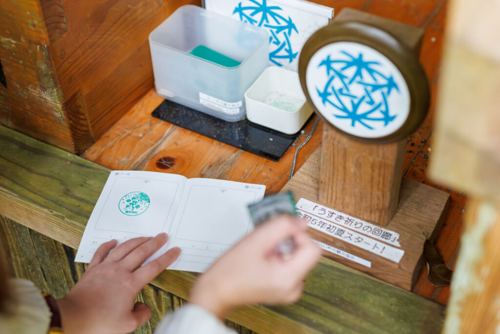 うすき祈りの回廊のガイド、古谷美和さんが案内してくれた。まずは野津町泊の白山(はくさん)神社。国指定天然記念物の風連鍾乳洞を過ぎ、山道を3キロほど進むと、深い森に抱かれるように存在する。平安時代末期から鎌倉時代にかけて建てられたそうで、神仏習合の姿を今に伝えている。急な石段を登り切ると、ガラスの目を持つ狛犬が出迎える。「狛犬は職人さんの個性が出るから、見比べると面白いですよ」と古谷さん。縁結びの神様(菊理比売神・くくりひめのかみ)だそうで、しっかりお参りした後、スタンプ手帳に押した。