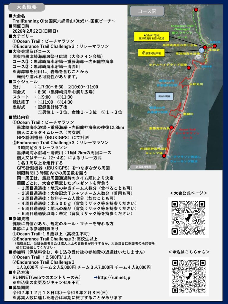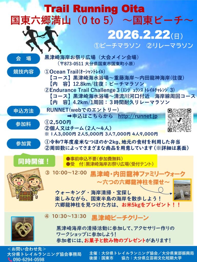 大分県トレイルランニング協会と大分県東部振興局の共催で、国東市黒津崎海水浴場~内田龍神海岸にてビーチマラソン&リレーマラソン大会「Trail Running Oita 国東六郷満山(0 to 5) ~国東ビーチ~」を初開催します!