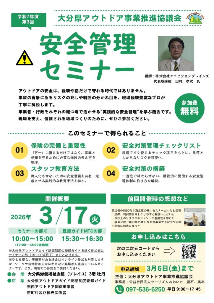 アウトドア活動を安心安全に楽しむとともに、自然環境に対する保全意識の向上を目的として活動している大分県アウトドア事業推進協議会主催で、下記のとおりアウトドア環境下における安全管理セミナーが開催されます!